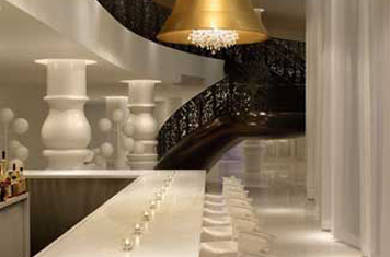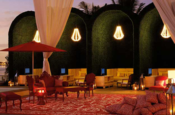 Accessed via a staggeringly chic valet area, visitors arrive to the interior lobby of the Mondrian Hotel designed by Marcel Wanders. With its signature burned Mooi chairs and iconic artwork, a staff dressed in lounge resort wear guides visitors to their appropriate area while turning away curious riffraff in denim shorts and washed-out tank tops. A concept of indoor/outdoor design begins in the interior bar, wedged along the first floor bar near the dramatic black-lacquer staircase. Whimsical pillars that uphold the second story atrium recreate Alice in Wonderland architecture, accented by billowing white swags of fabric that have become a Miami design icon. The bar continues onto the main pool deck, with its red outdoor furnishings created by Base on Lincoln Road with rich red rugs with Moroccan pouf pillows. A row of several sleek cabanas contain oversize white lounge furnishings created by Wanders himself, framed in ivy topiary ceilings and glitzy chandeliers. By late night the space comes to life in the gentile sway of ocean breezes and house DJs that spin lounge anthems to a crowd of sexy bronzed singles till 3am.